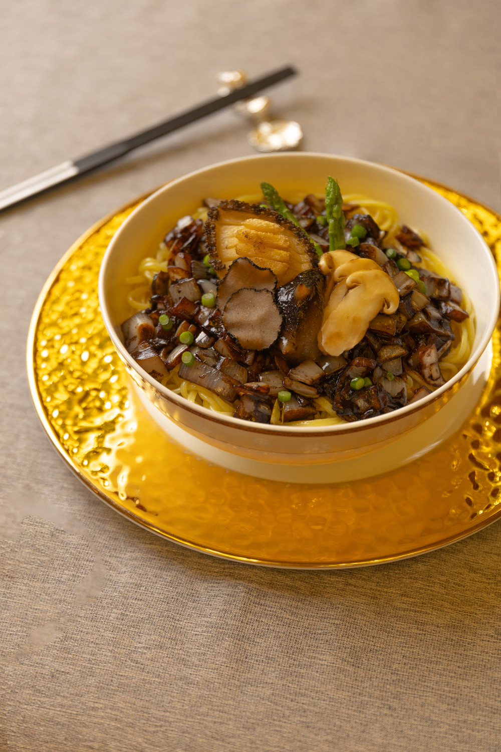 하이원리조트의 격조 높은 중식당 "오리엔"의 시그니처 메뉴, "황후 짜장면"의 정교한 플레이팅 과정을 담은 커머셜 푸드 포토그래피입니다. 황후라는 이름에 걸맞게, 최고급 식재료인 트러플과 전복을 듬뿍 올린 화려한 비주얼을 강조했습니다. 셰프의 섬세한 손길이 담긴 이 사진은, 윤기 흐르는 짜장 소스와 다채로운 고명들의 질감을 극대화하여 시각적으로 깊은 풍미를 전달합니다. 호텔 파인다이닝으로서 오리엔이 추구하는 고품격 미식 경험을 상징적으로 표현한 작업입니다.